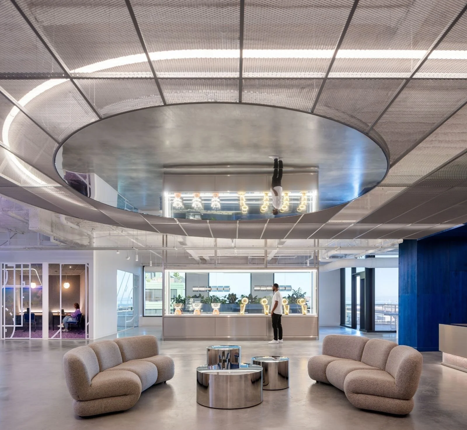 The project includes approximately 54,600 usable SF of interior office renovation to relocate their administrative office program out of the Chase Center Arena. The new interior features office spaces, a feature bleacher stair, a training room with a SkyFold door, a trophy case, and Golden State-themed branding elements.